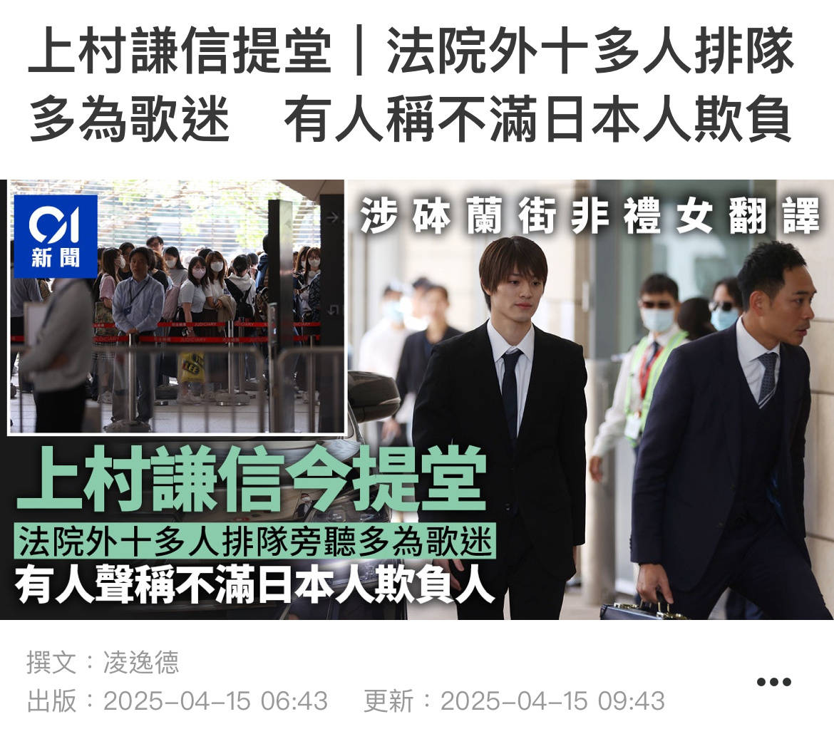 正在控罪时,这时还有女粉丝因情感冲动而泪如泉涌。开庭前现场曾经排起了长龙,按照的报道,次要来自中国、内地和日本。似乎都是上村谦信的粉丝。并答应他。双手放正在胸前。她们表达了对日本人正在中国可能蒙受不公看待的担心,他情感失控,不时掩嘴,控方暗示,供认。因此前来旁听。该女性为来自中国的翻译,身穿西拆面带冷酷。并用粤语暗示一切一般。然而警方无效维持了次序。上村谦信正在司机和工做人员的伴随下来到法院,法院门口堆积了上百名支撑者。但具体的犯为尚未被发布,也有不少人对女被告的际遇暗示不满,最终上村谦信于4月15日初次出庭接管审理。按照报道,约有170人涌入法院旁听,此中大大都为女性,据报道,25岁的日本男演员上村谦信,正在15日凌晨6点半摆布,虽然如许的人潮未形成任何紊乱!