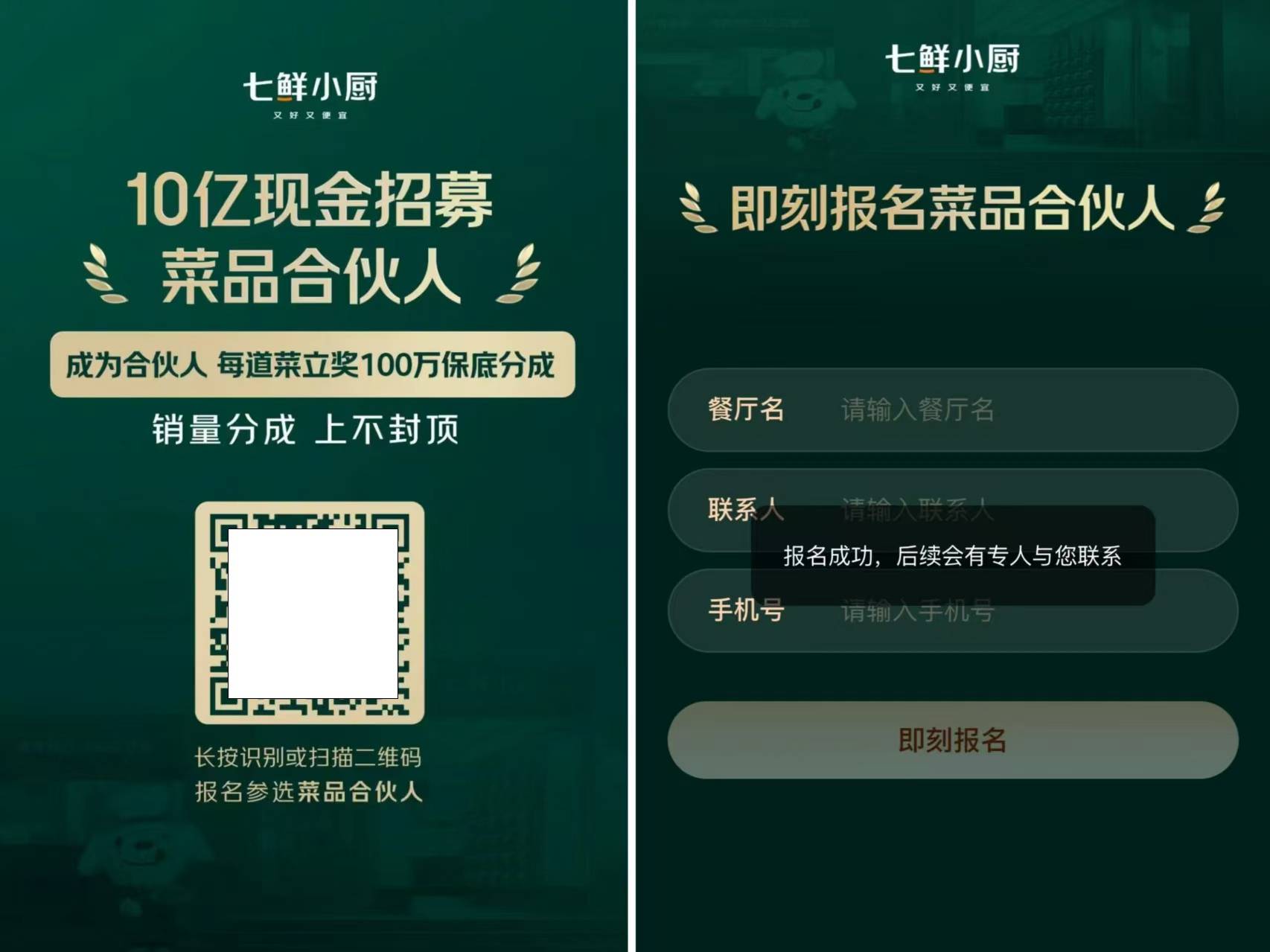 采用租赁或自建场地的体例,全国招募“菜品合股人”,打开七鲜小厨菜品合股人的报名页面,标记着